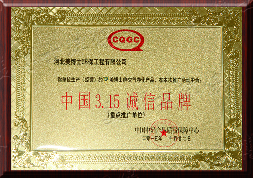 公司因其生產經營的美博士牌空氣凈化產品被中國中輕產品質量保障中心于二零一五年十月二十二日評為中國3·15誠信品牌。美博士環保會繼續以其實實在在的產品質量,為國民造福。