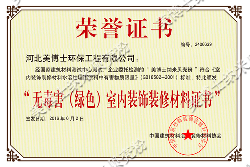 美博士經國家建筑材料測試中心,企業委托檢測的“美博士納米貝殼粉”符合《室內裝飾裝修材料水溶性墻面涂料中有害物質限量》(GB18582-2001)標準,中國建筑材料裝飾裝修材料協會于2016年6月2日特此頒發了“無毒害(綠色)室內裝飾裝修材料證書”
